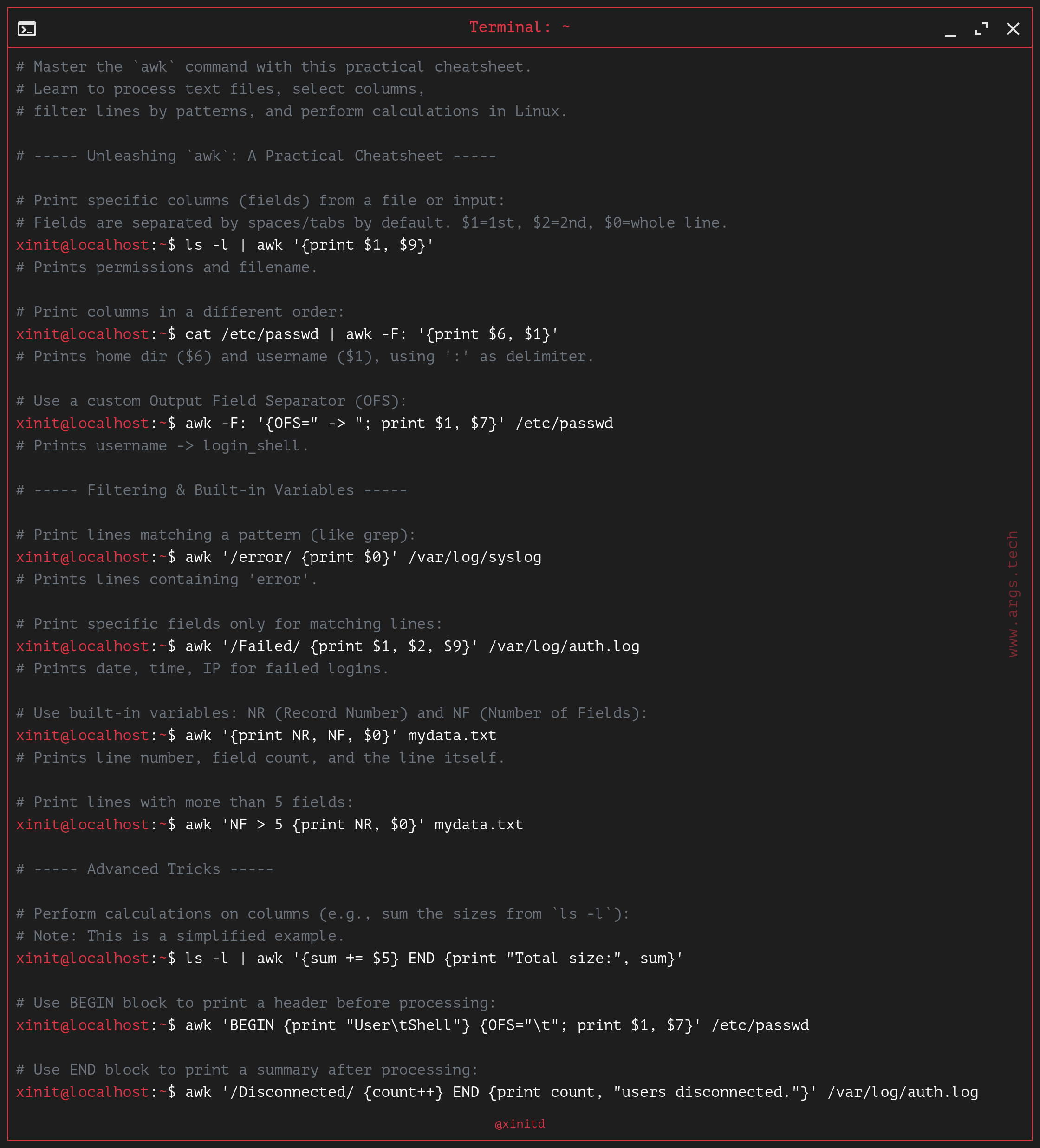# ----- Unleashing `awk`: A Practical Cheatsheet -----